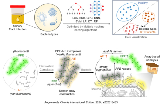 为解决这一问题,该团队开发了一种基于“信号放大”效应的聚对苯乙炔(PPE)和多种带正电荷的聚集诱导发光(AIE)染料构建的静电复合物传感器阵列。该传感系统能够对细菌产生双通道荧光“turn-on”信号响应,实现了无需对样本进行任何预处理情况下对低浓度(OD600 = 0.001)下20类细菌的并行检测,以及细菌的定量检测和混合细菌鉴定。结合多种人工智能机器学习算法优化,该传感系统在无需对样本进行预处理情况下,30秒内可实现对不同种类尿路感染临床样本的快速鉴定,极大地提高了检测效率。该传感器阵列结合了具有相反性质的两类荧光染料,实现了信号放大,提升了检测灵敏度,突破了临床感染性疾病诊断中存在的“检不出”、“检不准”、“检不广”的技术瓶颈,展示了巨大的临床应用潜力。未来团队将进一步开发便携式、智能化、多功能的并行检测设备,推动这一技术的临床转化和应用。