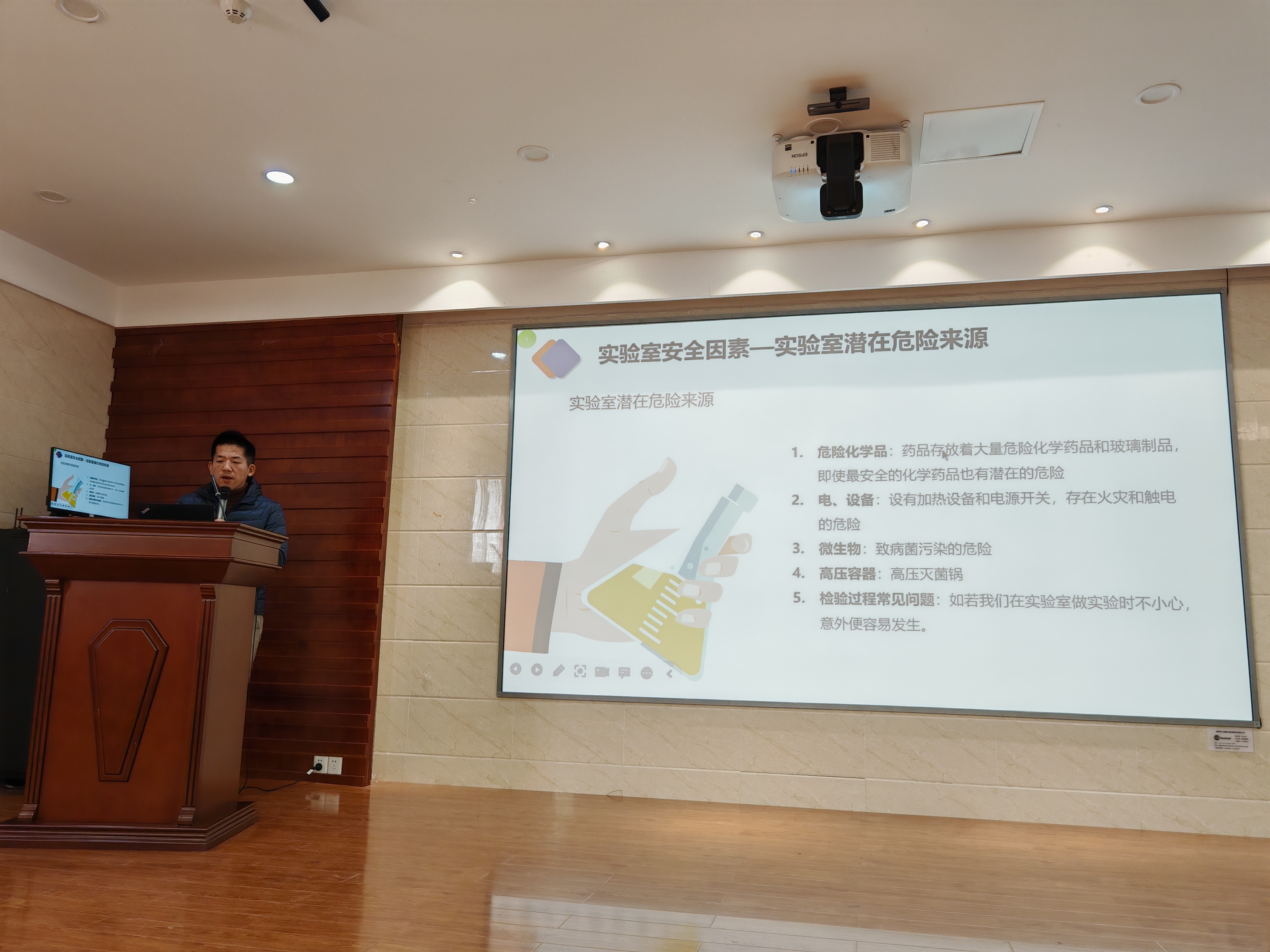 会上,袁彪老师从实验室的常见危害以及如何做好安全管理工作等方面进行讲解,提醒大家在实验室工作时要穿戴好实验服、手套等防护品,必要时戴好护目镜等保护用品,严格遵守操作规范,严禁在实验室内饮食。之后,袁彪老师列举了近些年发生的校园重大安全事故,细致剖析了事故原因,告诫大家不要存在侥幸心理,稍有不慎就有可能造成悲剧的发生,安全意识要牢记于心中。