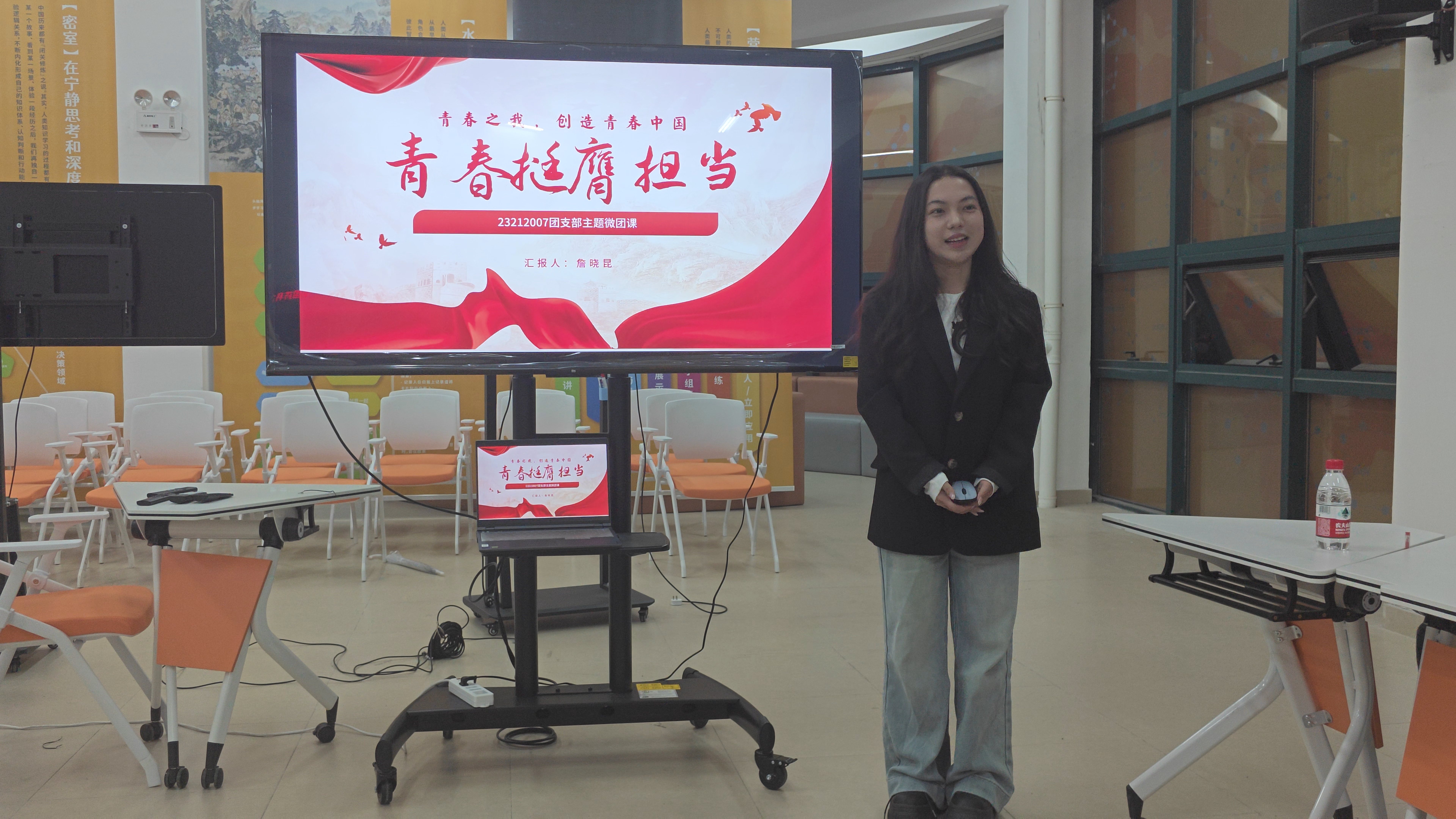 微团课过程中,23212007班团支部以“青春挺膺担当”为主题鼓励青年一代以青春之我,创建青春之国家;23212008班团支部以“山河虽无恙,吾辈当自强”为切入点,通过讲述众多将青春奉献给中华民族生死存亡的英雄故事,诠释了青春的定义并号召青年一代要“进前而勿顾后,背黑暗而向光明,为世界进文明,为人类造幸福”,不负青春,挺膺担当。