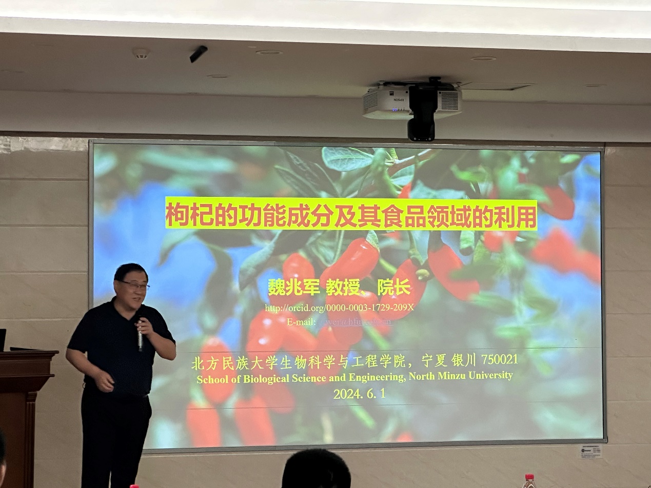 魏兆军教授以“枸杞的功能成分及其食品领域的应用”为题,从枸杞出发,阐述了宁夏枸杞产业的发展现状、枸杞的功能成分、健康功能以及北方民族大学团队开展的枸杞方面相关研究工作,展示了其团队的10余项研究成果。