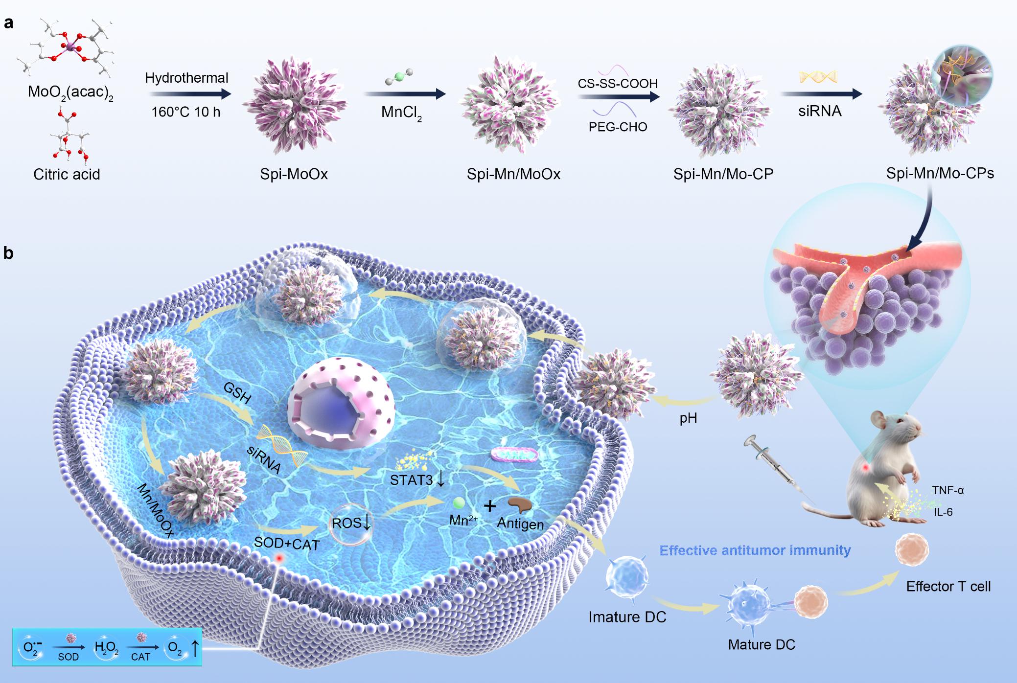 近日,EVO真人视讯邓大伟课题组在工科顶尖期刊Advanced Functional Materials发表最新研究论文:Physicochemical Cues Steering Spiky Mn/MoOx Nanocarriers to Mimic Oncolytic Virus for Potentiating Cancer Immunotherapy。公司博士研究生赵利营为论文第一作者,邓大伟教授为论文通讯作者,EVO真人视讯为论文唯一通讯单位。