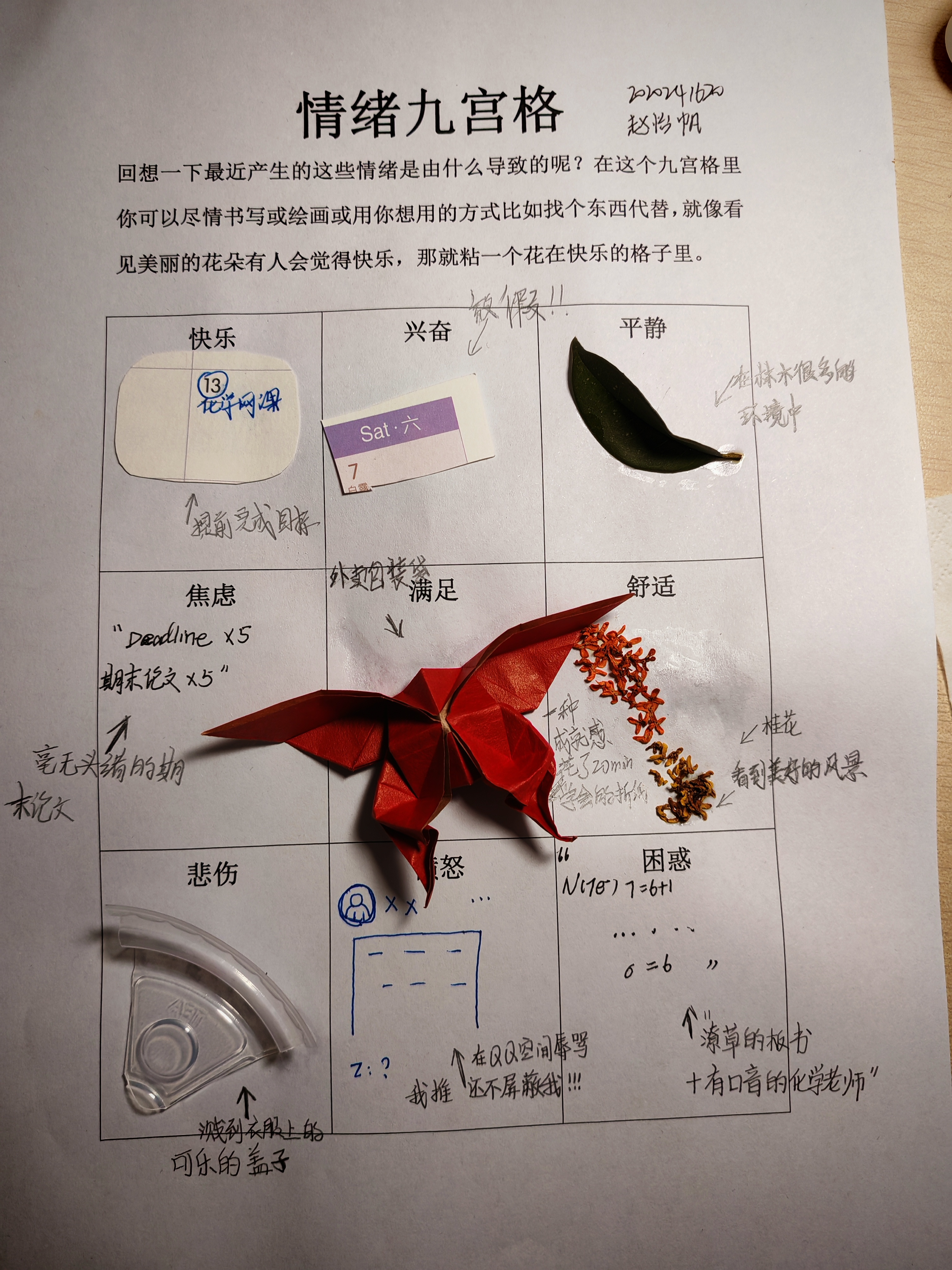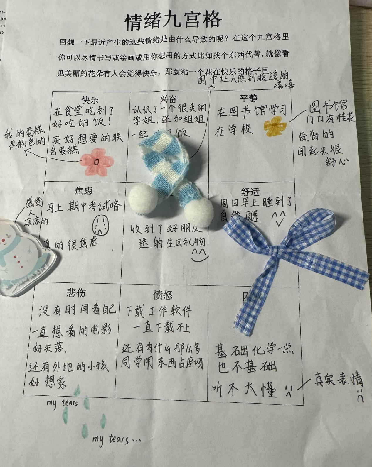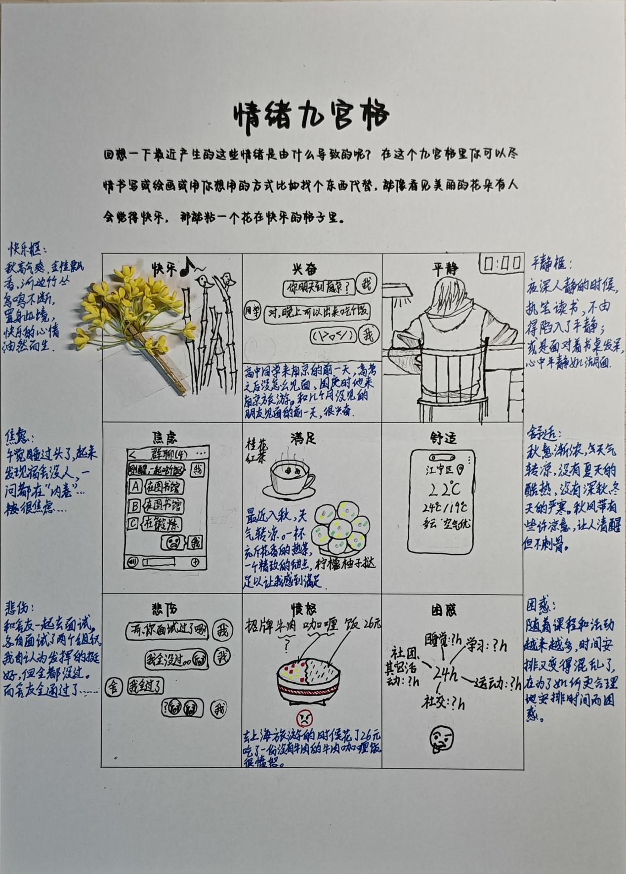 本次活动吸引了众多同学参与。活动中,大家根据要求认真回想近期发生的事情,将近期的各种情绪通过描述、贴画等方式具象表现在“情绪九宫格”中,并进行拍照上传。