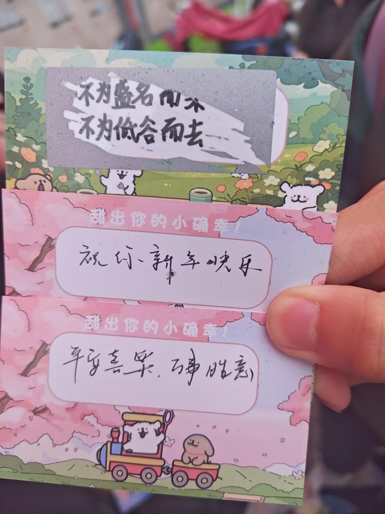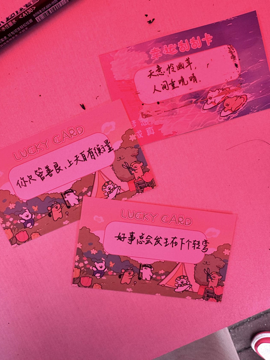 活动中,工作人员提前了准备一些已制作好的有关暖心话语的“刮刮乐”。参与活动的同学在抽取、刮开“刮刮乐”的同时,现场书写并制作新的暖心“刮刮乐”,交由之后参与活动的同学刮开,将这种暖心之举传递下去。