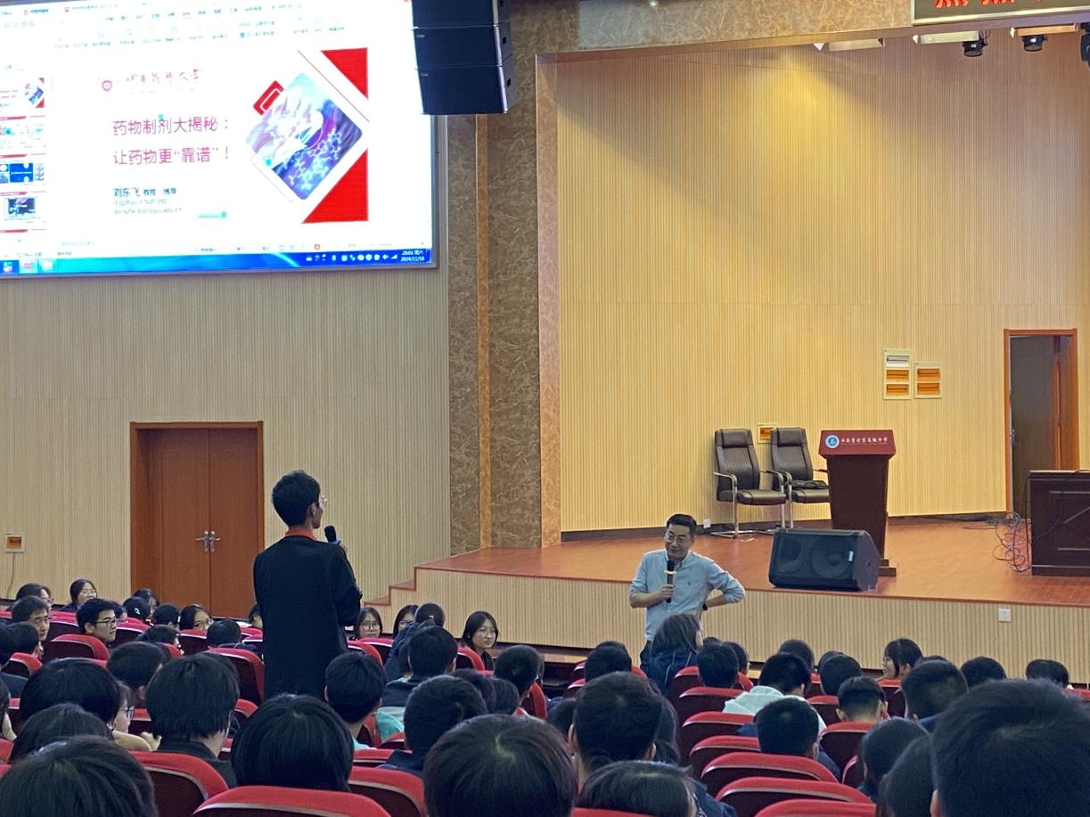 在宣讲活动现场,刘东飞教授以“药物制剂大揭秘:让药物更‘靠谱’”为主题,为句容高级中学高二学子带来了一场生动的科普讲座。他从日常生活中的药物制剂实例出发,以浅显易懂的语言引导员工们认识药物制剂在现代医药中的关键作用。他强调:人类文明,源远流长,药物是人类战胜疾病的重要手段,药学是一个神秘的研究领域,药学是无所不在的科学,攸关国家安全、人民福祉,鼓励同学们勇于探索,积极参与药学专业的学习与研究,为医药事业发展贡献智慧和力量。讲座中,刘教授还详细介绍了公司的专业特色、研究实力、团队力量、科研成果、校园生活,全面展示了公司的综合实力和独特魅力。讲座过程中,刘东飞教授与同学们积极互动,耐心解答问题,现场气氛十分热烈。