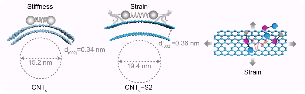 水体中药物等新污染残留造成了全球性的环境污染问题,引起了国家高度重视。在非均相高级氧化技术中,已提出了众多关于碳纳米管(CNT)改性策略用于提升水体修复过程中的催化性能的研究。受此启发,本研究首次揭示了应变缺陷位点对氯化反应的调控作用。研究发现,拉伸应变的sp2杂化C-C键缺陷位点显示出更强的自旋-晶格弛豫,与自由氯分子通过初始的Yeager型吸附,从而发生强化的电子交互性,显著提高氯化过程中对活性物种的析出与调控能力。实验结果表明,高选择性ClO•的比例从传统基于缺陷体系中的38.8%提升至由应变主导的87.5%,有效促进了2,4-二氯苯酚(2,4-DCP)的无害中间体生成以及深度矿化。这项研究结果揭示了应变效应在水体药物降解过程中的关键作用。