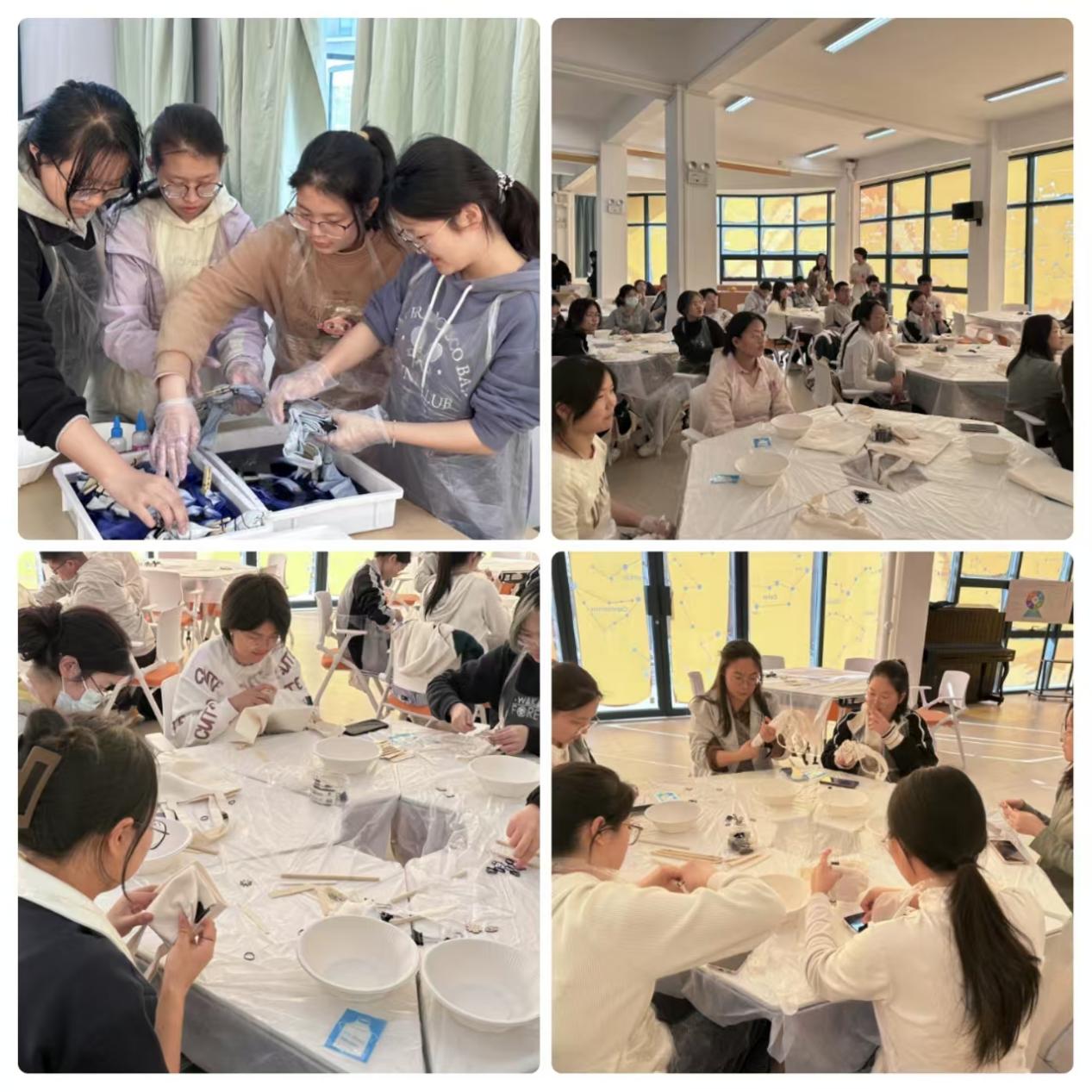 活动精心设置文化解码、技艺传习、创意实践三大环节。在文化解码环节,工作人员通过影像资料与实物展示,系统解析了扎染技艺自秦汉至今的千年流变,着重阐释了古法植物染中“取之自然,归于自然”的生态智慧。随后的技艺传习阶段,工作人员现场演示绞缬、夹缬等六大传统工艺,手把手指导学子运用皮筋、木夹等工具创作纹理雏形。在创意实践环节,参与者领取环保帆布袋与天然植物染料,通过浸染、氧化、固色等工序,将水墨山水、花鸟纹样等东方美学元素定格于布面,百余件蓝白相间的扎染作品在师生巧手中焕发新生。
