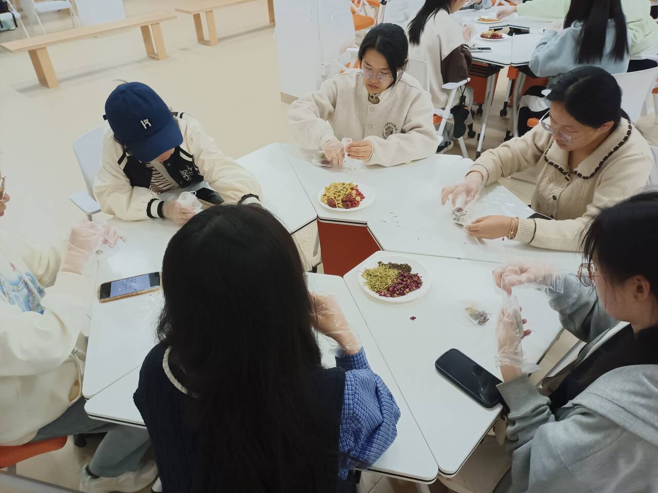 活动伊始,主持人通过生动的PPT讲解,介绍了菊花、金银花、决明子等常用中药材的药理特性,并分享了清热明目茶、健脾祛湿茶、养颜美容茶三种配方。随后,在工作人员的指导下,同学们纷纷动手实践,将枸杞、红枣、玫瑰等天然草本材料按比例装入茶包,体验从选材到封装的全过程。现场氛围热烈,同学们边制作边交流养生心得,不少小组还创新搭配出个性化茶饮组合。