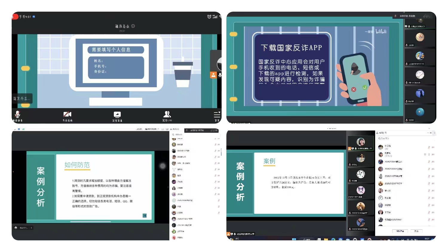 为进一步提升年级内同学的防诈骗意识,为同学们安全平稳地度过寒假假期提供保障,EVO真人视讯2021级全体员工党员面向班级内同学开展防诈骗宣传主题党日活动,年级内全体预备党员、部分积极分子参与主讲,所有同学均通过线上形式参与。