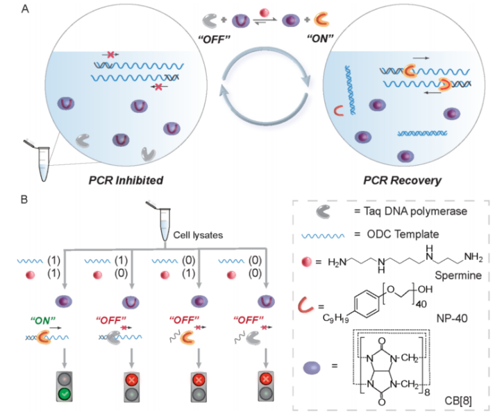 近年来,胡驰/狄斌团队围绕精神活性物质的关键标记物分析检测方法开展了大量研究工作(Toxicol. Lett. 2022, 367, 88-95; J. Hazard. Mater. 2023, 443, 130147; Anal. Biochem. 2022, 659, 114936)。本研究在前期工作基础上,建立了一种全新的策略,将经典PCR法的检测对象由核酸拓展为遗传和代谢标记物的双模态检测。该方法简单的通过在商品化PCR试剂盒中加入葫芦脲对Taq DNA聚合酶的活性进行操纵。葫芦脲与非离子表面活性剂结合并将其从Taq DNA聚合酶表面置换,导致酶活性降低。同时,当样品中存在鸟氨酸脱羧酶的下游代谢产物精胺时,精胺与表面活性剂竞争性结合葫芦脲,使聚合酶活性得到恢复。该方法不仅减少了假阳性结果,而且扩大了PCR技术的检测范围。例如,使用此方法仅在高活性HEK 293T细胞中观察到阳性结果,而经鸟氨酸脱羧酶抑制剂处理的沉默细胞显示出阴性读数,因此为精确诊断提供了一种简单便捷的双模态PCR方法。