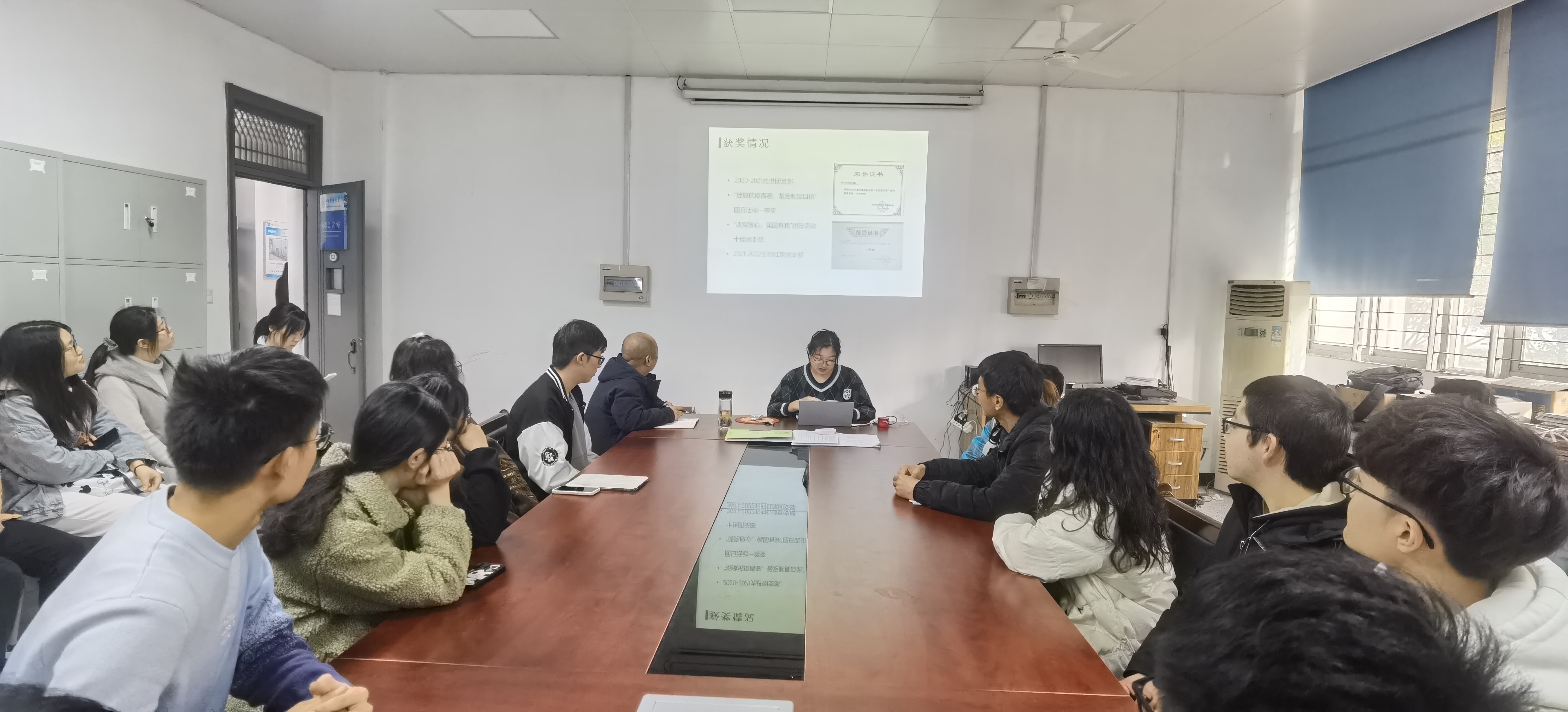 根据公司关于开展“青春践行二十大”主题班会的有关通知,班会伊始,辅导员冯同利与参会人员共同学习了公司“书记第一课”“董事长第一课”相关内容。接着,蔡雨宸同学从班级介绍、活动掠影、获奖情况、未来规划四个方面介绍班级整体情况。