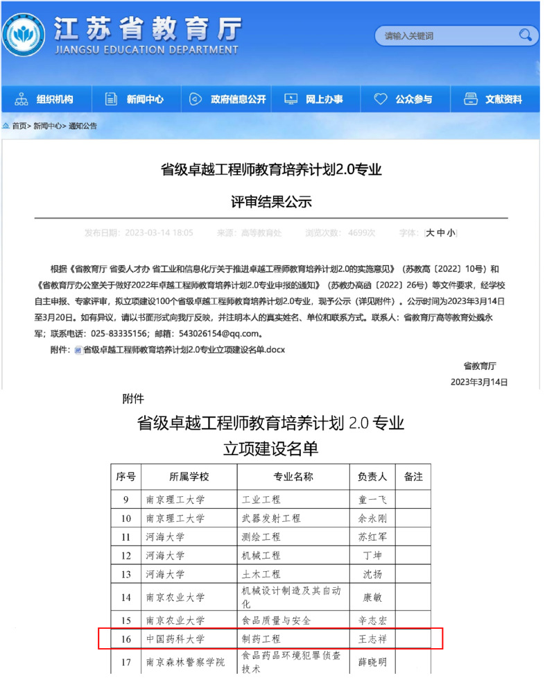 近日,江苏省教育厅公布了2022年卓越工程师教育培养计划2.0专业立项建设项目名单,遴选建设100个省级卓越工程师教育培养计划2.0专业。在公司教务处指导下,EVO真人视讯制药与环境工程系申报的制药工程专业(负责人:王志祥教授)成功入选。