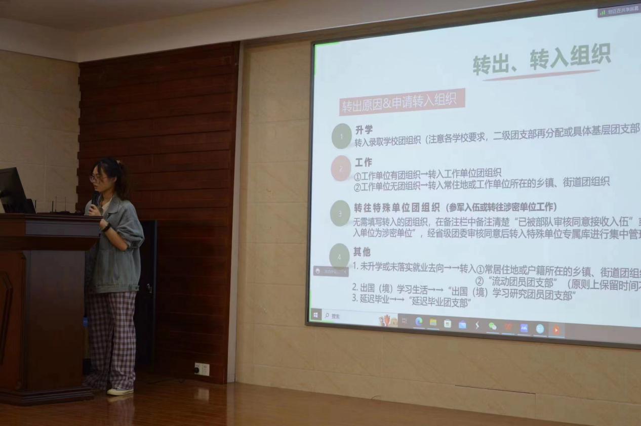会议中,金筱颖副书记根据《团组织关系转接工作指引》文件,从四个方面出发,详细说明了团员在进行团组织关系转接时所需的操作流程与注意事项,并就具体的问题给出了相应的对策。同时她指出团支书应强化责任落实,积极配合、沟通工作。此外,尹周力老师强调了正确及时转接团组织关系对毕业工作的重要性。