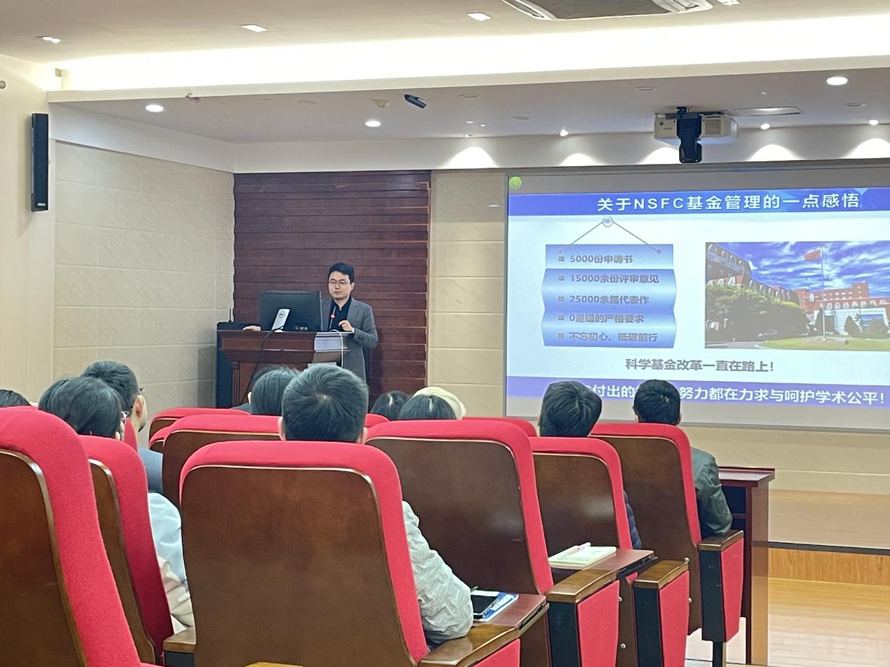 随后,郭教授基于他国家自然科学基金委医学部流动项目评审的任职经历,同与会师生分享了国家自然科学基金项目申报的经验,向在座师生介绍了评审流程,并从评审人的视角,对撰写项目申请书需要注意的事项,提出了富有针对性的建议。郭教授的讲解通俗易懂、幽默严谨,令与会师生受益匪浅。